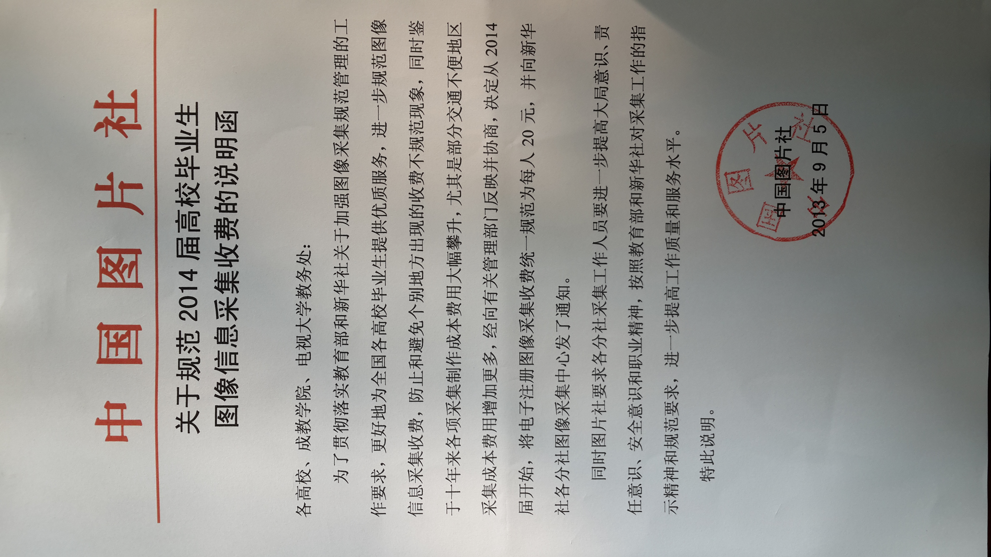 三、依据中国图片社“关于规范2014届高校毕业生图像信息采集收费的说明函”,图像信息采集收费标准调整为按每人20元收取,拍摄费用由学院统一收取,在本学院学生拍摄完毕后按拍摄人数交给现场的新华社工作人员。
