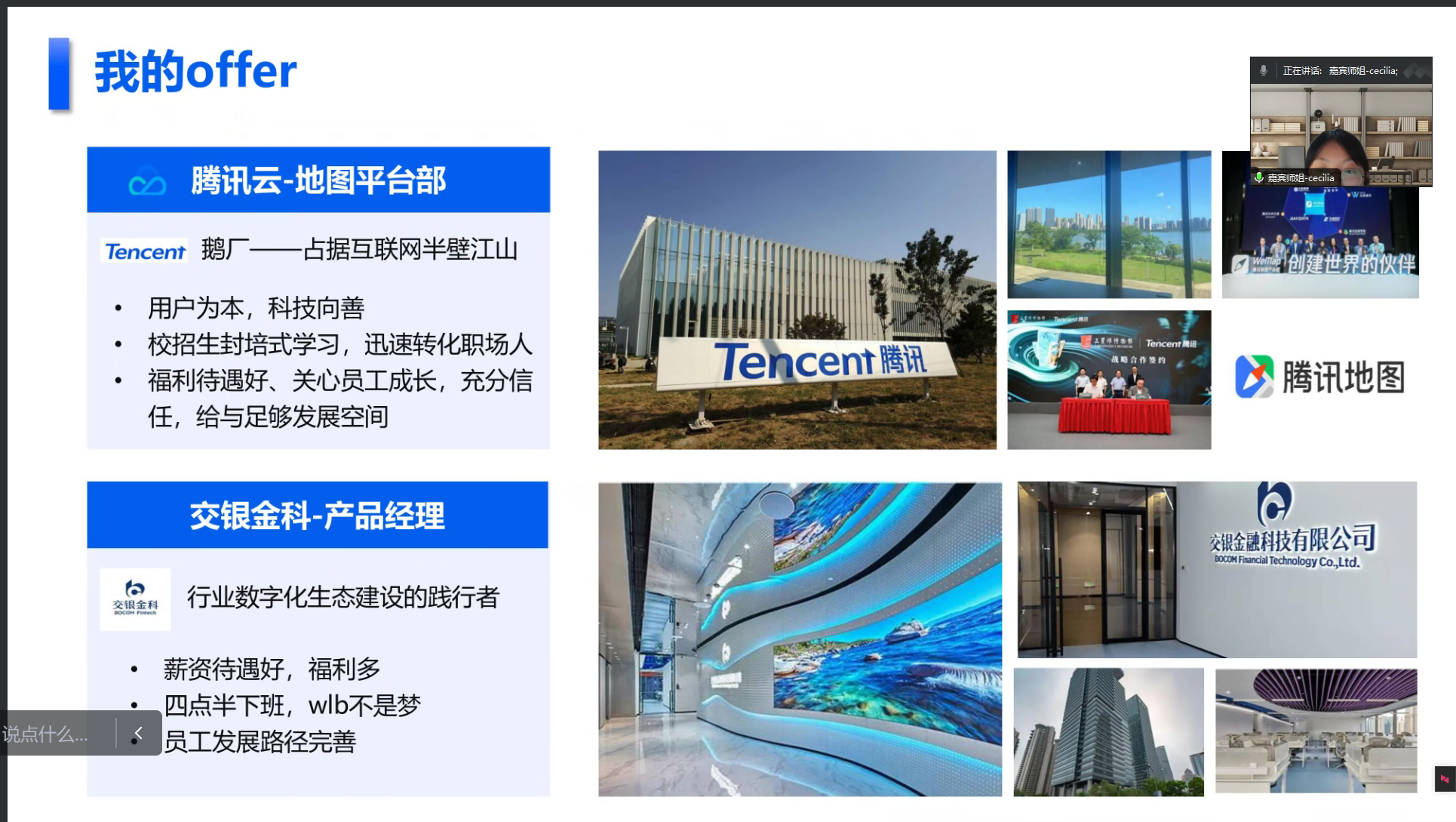 Cecilia学姐分享了从审计到咨询,再到券商和互联网产品岗位的丰富实习经历。从研一开始就有针对性地改善面试技巧,确保在实习、比赛、项目和校园经历上都有所涉及。在群面准备方面,Cecilia学姐熟悉并把握各个案例类型的常规解题思路,并在课后多做总结和思考,通过多次群面模拟演练,找到适合自己的节奏,逐渐克服群面的恐惧,面试结束后不断进行复盘进一步完善不足。同时,Cecilia学姐建议同学们在实习期间始终保持主动积极的工作态度,努力承担更多责任,拒绝眼高手低,遇到问题或困难时及时向导师或同事反馈。她的经历和最终选择的产品岗位为同学们提供了宝贵的参考,给予研究生们有效储备实习经验、准备简历和面试技巧以及在秋招中斩获心仪Offer一定启发。